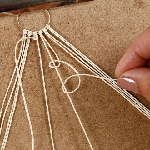 Stosując technikę wiązania makramą, możesz wykonać piękne kolczyki na pozłacanych kółkach. Każda para ma swój własny, niepowtarzalny wygląd boho z kreatywnymi węzłami w stonowanych kolorach - a dwie pary mają nawet długie, piękne frędzle. Wskazówka: Przymocuj kółko do podkładki za pomocą kawałka taśmy lub spinaczem, aby móc wygodnie wiązać węzły bezpośrednio wokół kółka.
