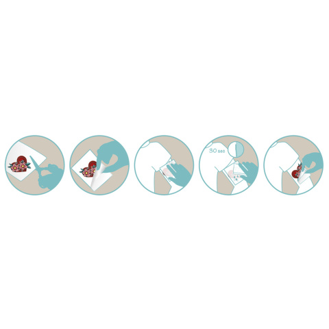 Wytnij wzór, zdejmij folię ochronną, nałóż wzór na skórę dziecka, przytrzymaj wilgotną gąbką przez 30 sekund, a Twoje dziecko zostanie wytatuowane jak dorosły.