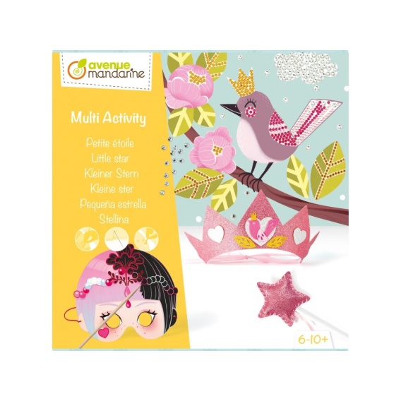 Zawartość: 3 kartonowe plansze 25x25 cm - plastikowe diamenciki w 5 kolorach - pojemniczek do wysypania diamencików - aplikator - klej do aplikatora - elementy do ozdobienia korony i uszycia różczki - 2 maski do wydrapywania - drewniany patyczek.