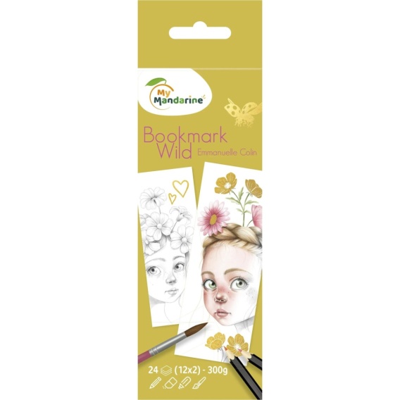 Papier rysunkowy Clairefontaine o gramaturze 250 g/m^2 pozwalający na użycie farby, pisaków i kredek. 24 arkusze (12 różnych wzorów powtórzonych 2 razy). Wymiary zakładek 16x6 cm.