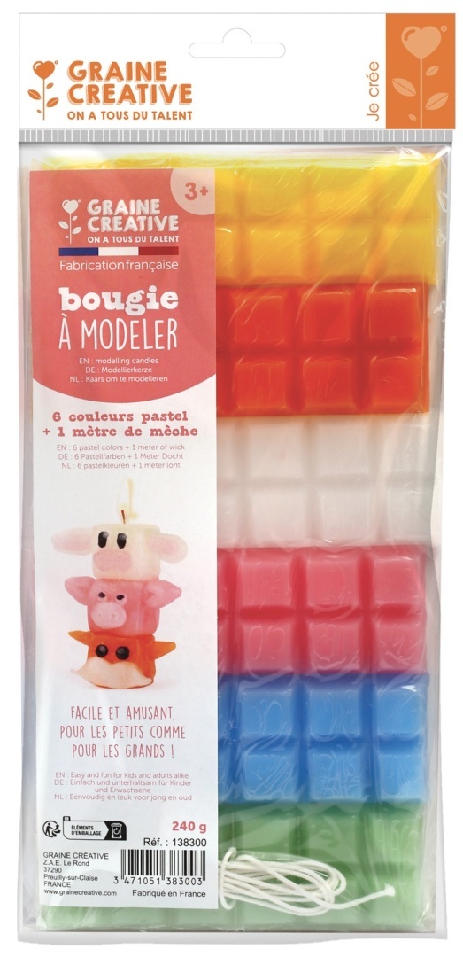 Zestaw zawiera 6 kolorów wosku w pastelowych barwach, biały knot i instrukcję obrazkową. Wosk ugniatamy w rękach i lepimy z niego figurki oraz różne kształty tak samo jak z plasteliny.