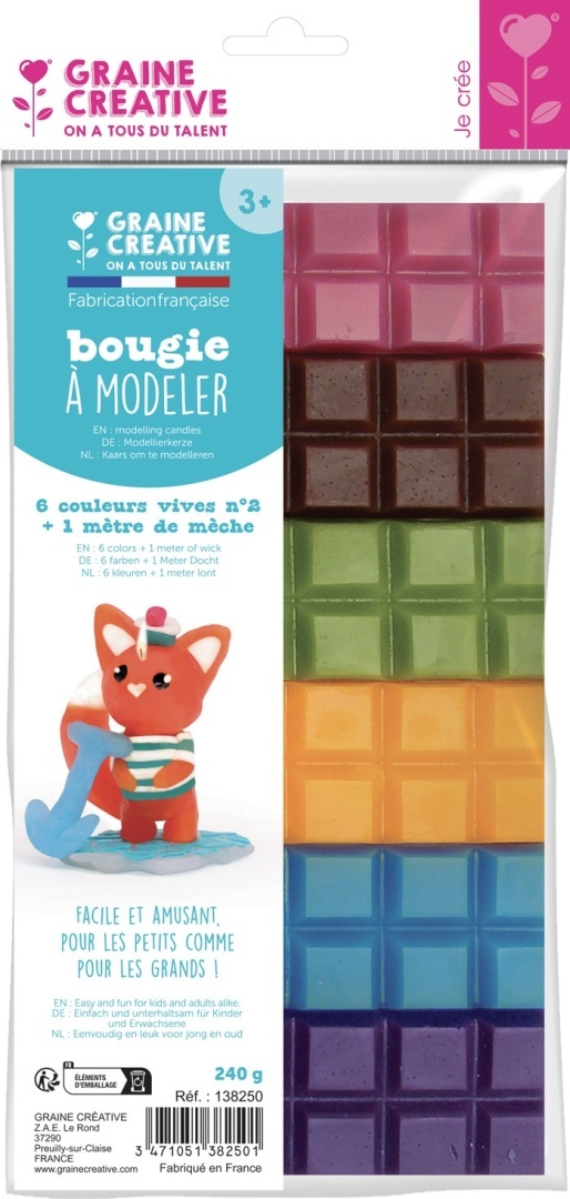 Zestaw zawiera 6 kolorów wosku w wyrazistych barwach, biały knot i instrukcję obrazkową. Wosk ugniatamy w rękach i lepimy z niego figurki oraz różne kształty tak samo jak z plasteliny.
