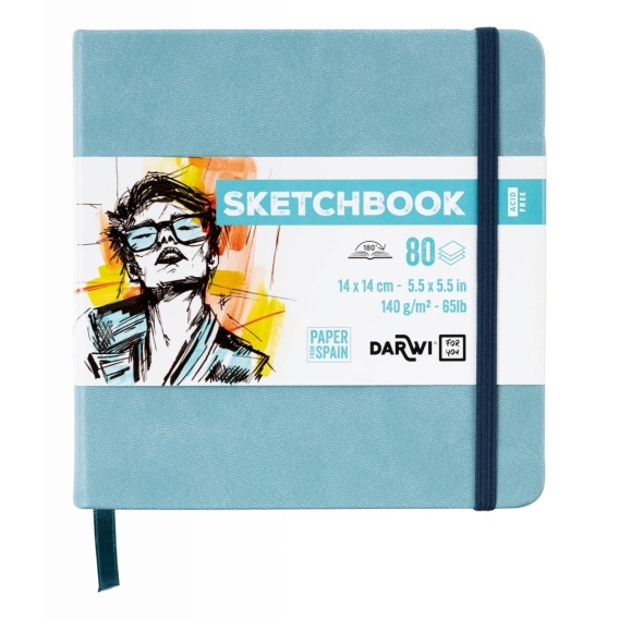 Szkicownik w twardej oprawie z zaokrąglonymi rogami, zamykany na gumkę. Otwiera się na płasko (180°).